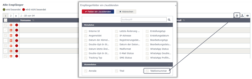 Die Felder können über das Zahnrad Symbol eingeblendet werden
