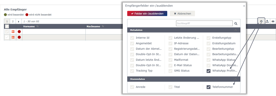 Der WhatsApp-Profilname kann bei Bedarf über „Empfängerfelder einblenden“ angezeigt werden, wird jedoch ebenfalls nicht standardmäßig angezeigt.